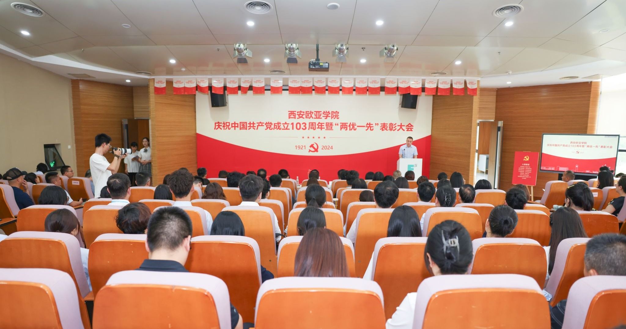 6月28日,学校庆祝中国共产党成立103周年暨“两优一先”表彰大会在图书馆学术报告厅举行。大会由党委副书记张军宏主持,学校党政领导、党委委员、纪委委员及师生党员代表近200人参加。党委副书记张军宏主持会议党委委员、组织部长赖志彬宣读表彰决定党委委员、组织部长赖志彬首先宣读《关于表彰2023至2024学年先进基层党组织、优秀共产党员、优秀党务工作者的决定》,14个先进集体和145名优秀个人受到表彰。党委书记赵国华,党委副书记、...
