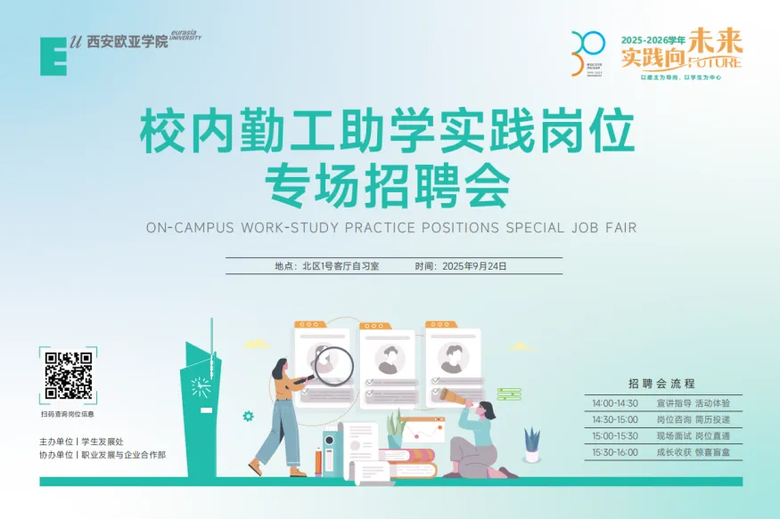 2025年9月24日14:00,2025-2026学年校内勤工助学岗位专场招聘会在北区1号客厅自习室圆满召开。依托学校“以雇主为导向,以学生为中心”的教育理念,为着重培养学生重品格、会思考、善沟通,具有国际视野、创新思维、专业技能及较强实践能力,学校统筹多方资源,系统设计了资助育人架构,为学生搭建项目实践平台,提升学生雇主思维及职场竞争力,帮助学生实现“从学业到就业”的角色转变。本次招聘会全校共31家用工单位参与,发布招聘岗位746个,...