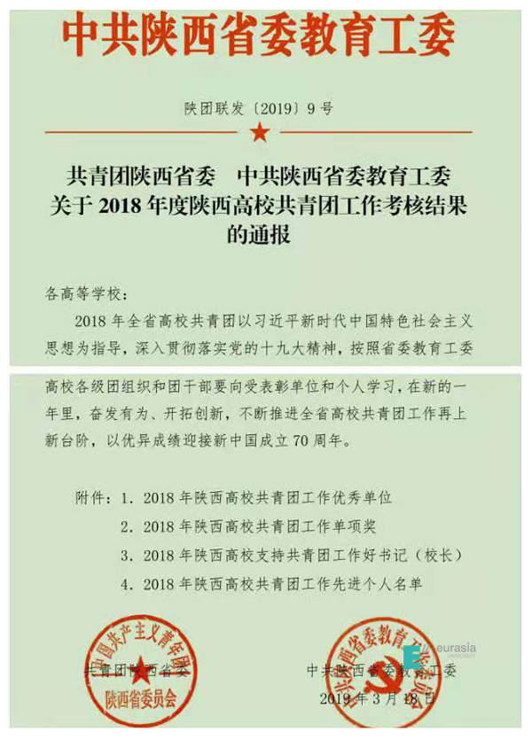 3月18日,共青团陕西省委办公室下发了《关于2018年度陕西高校共青团工作考核结果的通报》(陕团联发[2019]9号),beat365团委荣获“新媒体和网络宣传工作先进单位”称号,校党委副书记、校长刘瑾教授荣获“2018年陕西高...