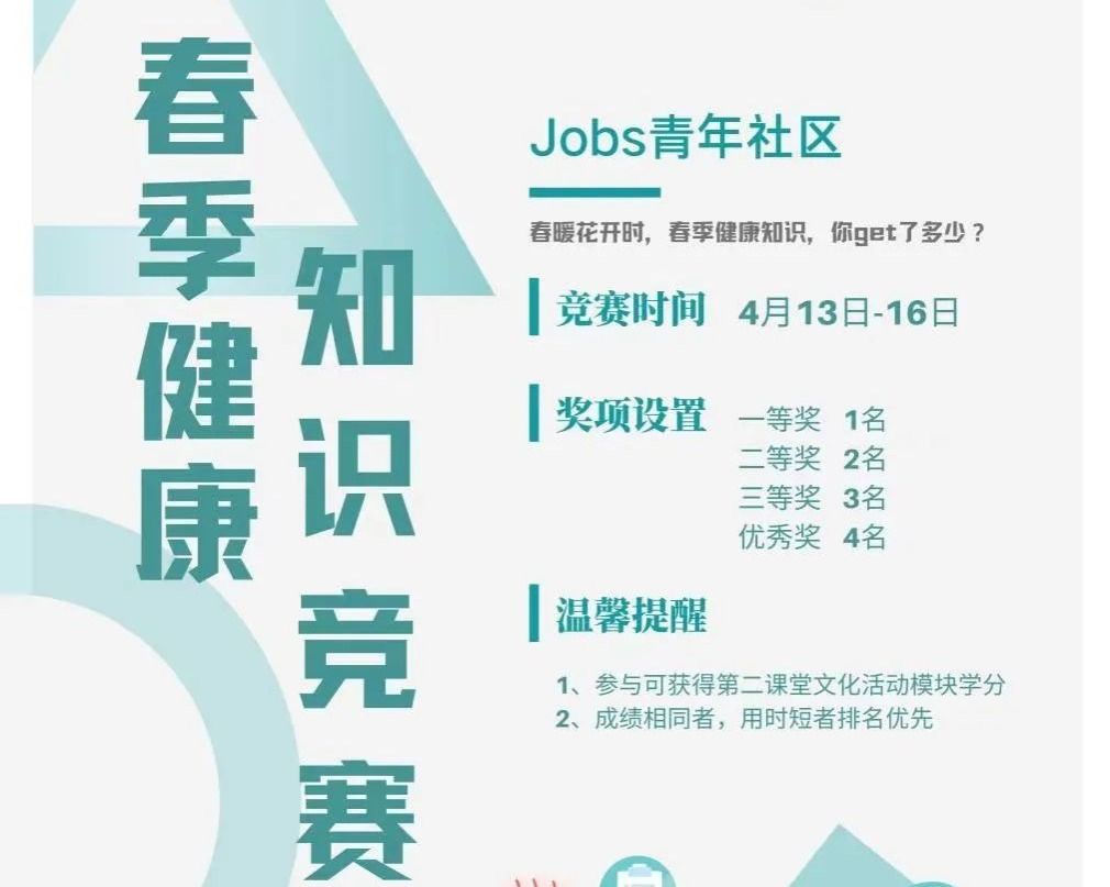 今年4月是第35个爱国卫生月,为进一步落实习近平总书记对爱国卫生运动作出重要指示,提升师生健康素养,提升劳动教育理念,第一青年社区分党委开展了以“春季健康”为主题的知识竞赛,竞赛题目涉及爱国卫生运动常识、春季传染病常识以及健康生活相关题目。本次大赛共进行4天,共有405名学生参加,经过激烈的线上比拼,最终角逐10名获胜的同学,获奖名单马上揭晓!一等奖陈星燕(辅导员:王雪辰)得分200分 用时49秒二等奖闫子怡(辅导员:...
