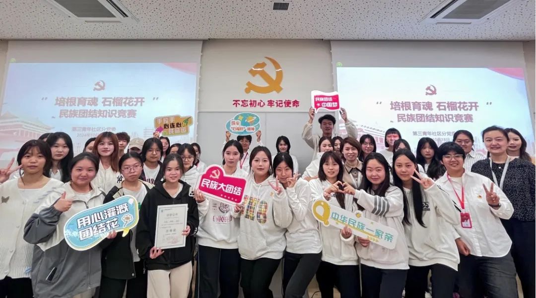 为进一步促进在校大学生对民族知识的学习和了解,筑牢中华民族共同体意识,第三青年社区分党委于2024年10月14-18日举办了一场精彩纷呈的民族团结知识竞赛。本次竞赛共分为初赛和决赛两个环节。第一环节:初赛选拔自10月14日民族团结知识竞赛活动发布以后,共有123名学生报名参赛。第三青年社区分党委对报名的同学进行了理论知识测试。经过笔试选拔,最终有9个小组、27名选手成功晋级决赛。第二环节:决赛竞技 10月18日,第三青年社区分党委民族团结知识总决赛在北E-...