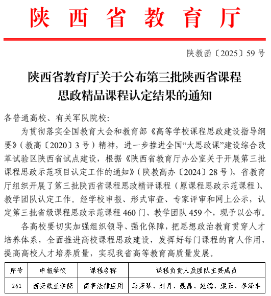 近日,陕西省教育厅发布了《关于公布第三批陕西省课程思政精品课程认定结果的通知》(陕教函〔2025〕59号),通识教育学院的《商事法律应用》课程成功被认定为省级课程思政精品课程(原课程思政示范课程)及教学团队。本次认定依据《陕西省教育厅办公室关于开展第三批课程思政示范项目认定工作的通知》(陕教高办〔2024〕28号)相关要求,经过个人申报、学院推荐、学校审核、省级专家评审及网上公示等环节,最终成功获得立项。近年来,...