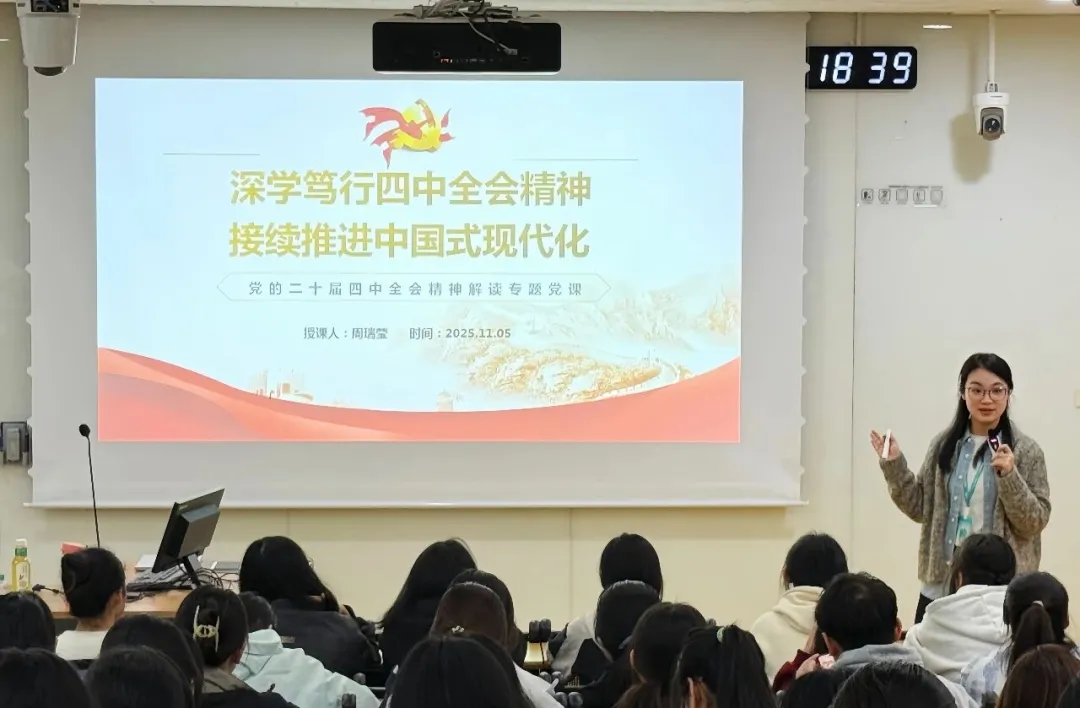 为深入学习贯彻党的二十届四中全会精神,引导青年学子深刻领会“十五五”规划的战略部署,第三青年社区分党委于11月5日在南D-001开展“深学笃行四中全会精神,接续推进中国式现代化”专题党课。本次党课由马克思主义学院教师周瑞莹老师主讲,110名入党积极分子参加。周瑞莹老师紧扣党的二十届四中全会审议通过的《中共中央关于制定国民经济和社会发展第十五个五年规划的建议》,围绕“锚定历史坐标、把握战略指引、回望五年答卷、解码权威解读、...