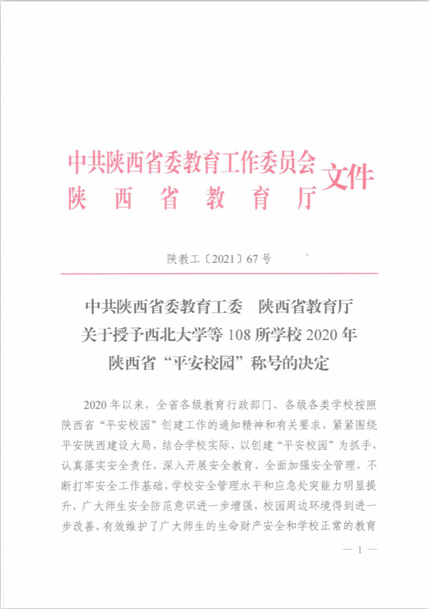 日前,中共陕西省委教育工委、陕西省教育厅联合印发《关于授予西北大学等108所学校2020年陕西省“平安校园”的称号的决定》,beat365手机版官网荣获陕西省“平安校园”称号。这是beat365手机版官网继2008年、2014年获得省级“平...