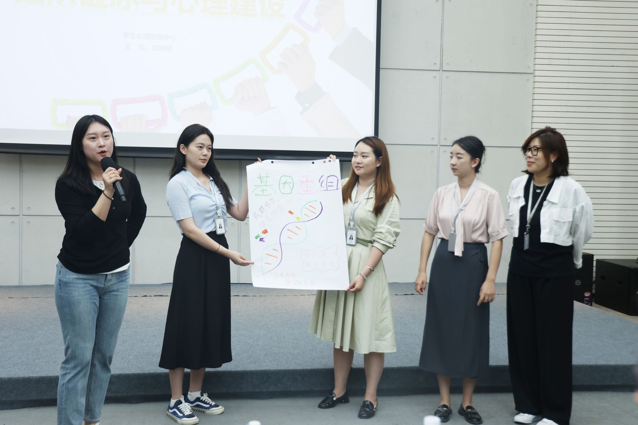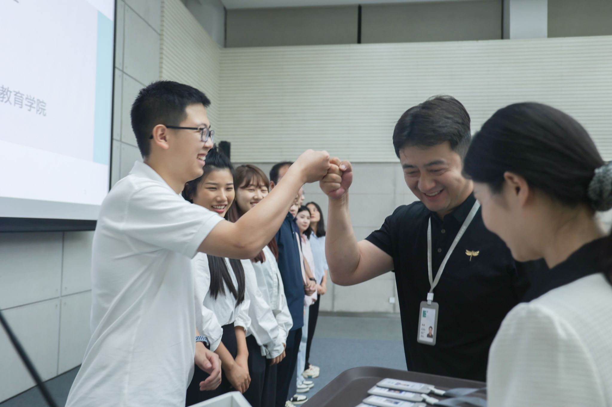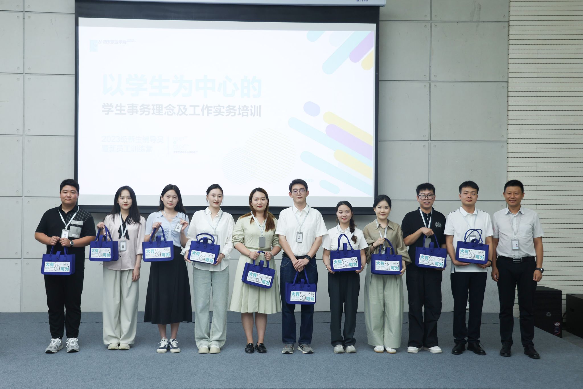 为提升新员工的入职体验,做好开训前的动员工作,9月1日下午14:00,培训班开班仪式在大学生活动中心多功能厅举行。在开班仪式上,学生发展处为新入职员工举行了仪式感满满的入职仪式,19名新入职老师依次进行自我介绍,学生发展处处长董杨、副处长张成为新入职的辅导员依次佩戴工牌并赠送入职礼物。