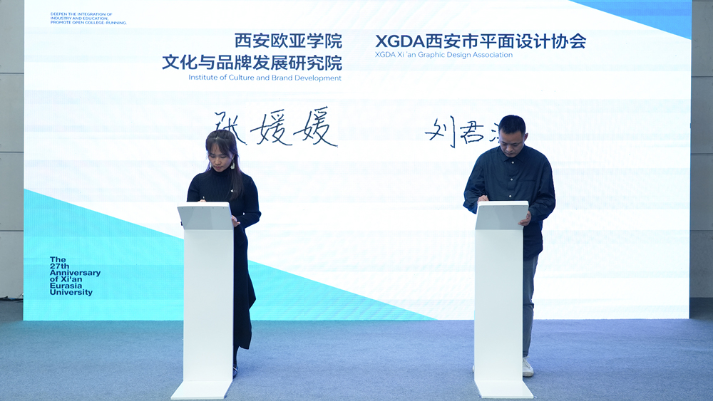 会上,beat365手机版官网品牌传播部副部长、文化与品牌发展研究院张媛媛和XGDA西安市平面设计协会主席刘君涛代表双方签订校企合作协议。西安市平面设计协会成立于2021年,致力于通过行业联动、资源整合、学术交流、设计推广、活动组织,促进区域内外设计文化的传播,搭建高层次设计交流平台,推动设计产业与专业融合发展,助力社会文化事业和人文环境的健康进步。此次双方以文化联结,将在文化园区建设、创意联盟活动、在地文化推广等方面多元联动,发挥设计创新优势,积极促进城市文化与品牌的发展。