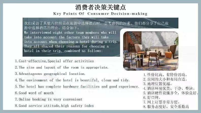 第十小组以“西安之旅”为引导线,通过如何选择酒店这一主题,衍生出消费者决策关键点,即大多数人在旅行中选择酒店会优先考虑酒店的价格,其次为地理位置,说明大多数的消费者更加注重性价比。在演示汇报中,展示页面清晰,一目了然,酒店的介绍全面,视觉元素与广告展示图片浑然一体。