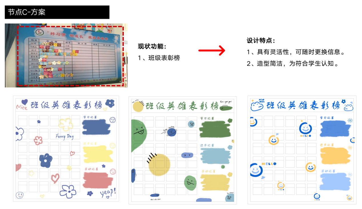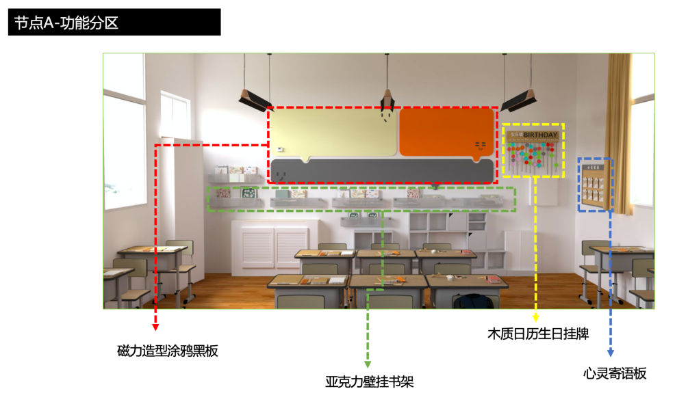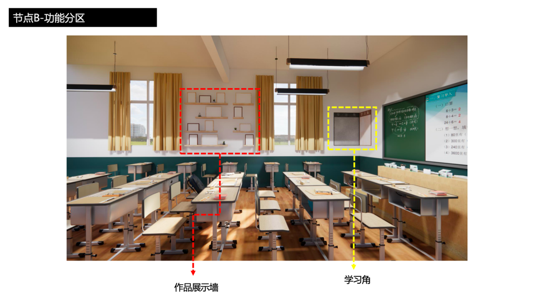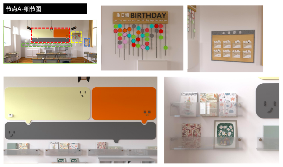 7月21日——8月30日,清涧项目组师生团队利用暑假时间,对方案进行深化设计。深化设计主要集中在1-6年级的教室内部环境,以及校园文化展示橱窗、教师粉笔字展墙、学校卫生间等公共空间的节点更新设计。结合教师和学生的使用需求,将教室空间划分出人文关怀区、才艺展示区、学术交流区、拼搏进取区4个主题区域。