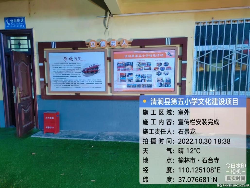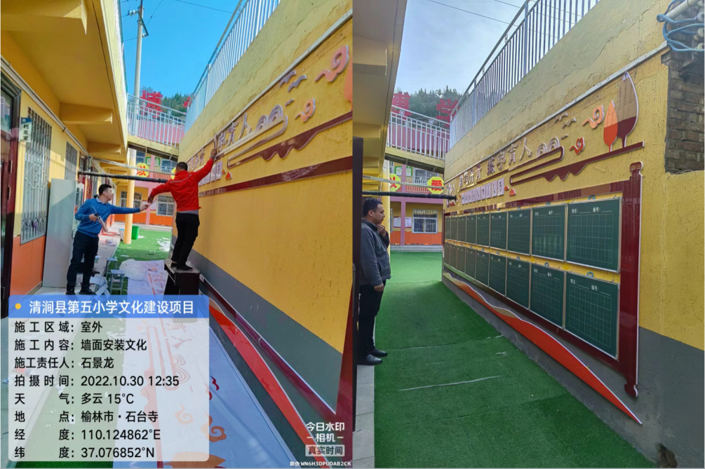 10月8日——10月30日,经过与清涧县第五小学的多次商讨后方案终稿形成,通过市场调研、选购材料、制作加工、施工安装等环节,第一批校园文化橱窗和教师粉笔字展墙顺利竣工。