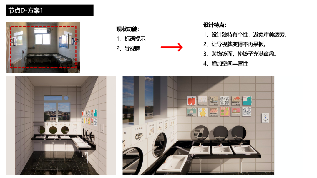 校园公共卫生间增设符合儿童身高的小镜子和孩子们手绘的插画标语,让原本呆板的空间更有活力,符合儿童审美。