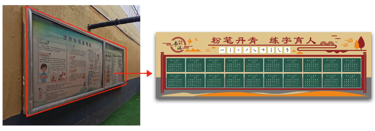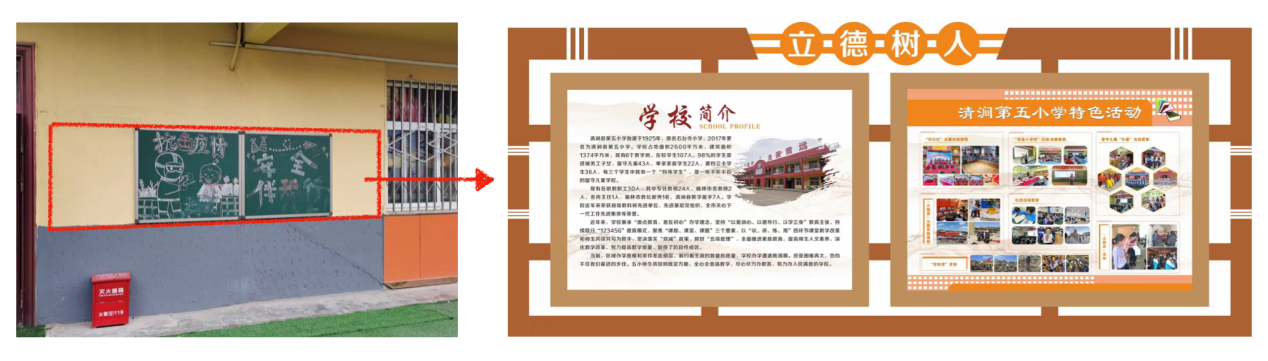 校园文化橱窗主要展示清涧第五小学的校园文化和师生风采,增加师生的认同感和荣誉感。教师粉笔字展墙,可以将老师们优秀的粉笔书法展示给学生,为学生树立优秀的榜样,同时促进老师们之间的互相交流学习。
