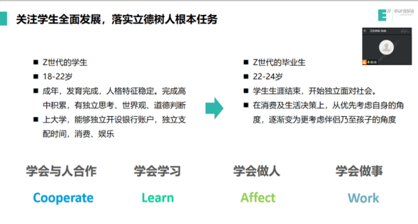Z世代指1995年至2009年出生的一代人,是随着移动互联网、手游、动漫等成长起来的一代,时代赋予了“Z世代”开放包容、勇于创新的精神。18-22岁的大学生们需要教育工作者去帮助他们成长为能够独立面对社会,有正确的理财意识、诚信意识、感恩意识的人,成为未来家庭和国家的栋梁。