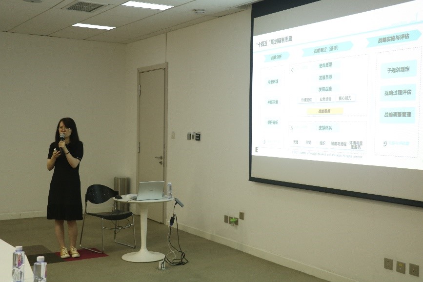 随后,进入部门分享环节。首先,人力资源部张李红老师结合学校“十四五”总体发展规划要求,重点对“十四五”期间人力资源工作的主要目标、重点举措和保障机制进行了分享。学校的人力资源工作将坚持“以教师为本”的理念,围绕组织、人才、文化和数字化四个方面开展工作,同时也通过组织、财务和机制三个层面为学校总体目标的达成提供充分保障。人力资源的工作在支持学校战略落地的同时,也要让教职工在组织中得到更好的发展,拥有良好的职业体验,不断提高成就感、归属感和幸福感。