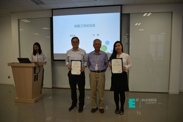 (图二)学校高级顾问曾腾光为获奖老师颁发“档案工作纪念”奖