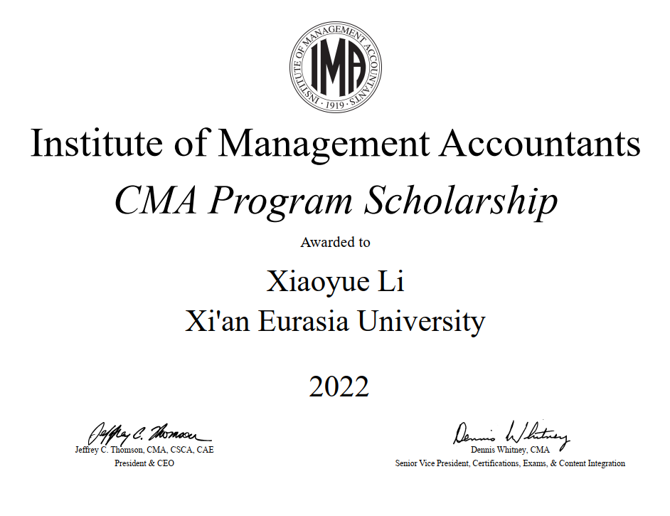 beat365会计学院邸宝怡、赵琦琦、李晓月、冯向怡、康梦洁等5位学生经过报名申请、提交复习计划、多维度筛选最终通过IMA协会审核,获得2022年度CMA奖学金。美国注册管理会计师(Certified Management Accountant,简称CMA)奖学金项目由美国管理会计师协会(The Institute of Management Accountants,简称IMA®)自2012年开始推广,为获得提名的优秀学生提供免费注册成为CMA考生及参加CMA考试的机会(等值约6,000人民币)。CMA证书作为享誉世界的国际管理会计通用证书,被全球180个国家认可,有国际财务界的MBA之称,是国际企事业单位财务从业者的必备证书。beat365学子荣获IMA协会CMA奖学金,标志着beat365财务管理专业关于管理会计人才培养工作及教学质量达到了国际职业人才培养与评价的认可标准。