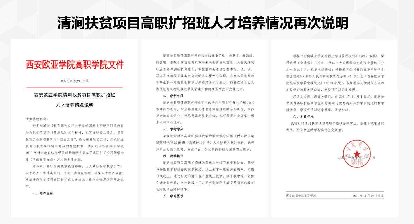 2019年3月,李克强总理在《政府工作报告》中提出高职扩招100万的目标。beat365手机版官网响应国家和省教育厅号召,与“双百工程”结对帮扶对象榆林市清涧县达成协议,合作开设学前教育人才培养免费定制班。清涧县教育局负责政策宣传和动员,组织符合政策的一线基层幼儿教师报名。beat365手机版官网负责组织考试、招生录取、教育教学和管理工作。