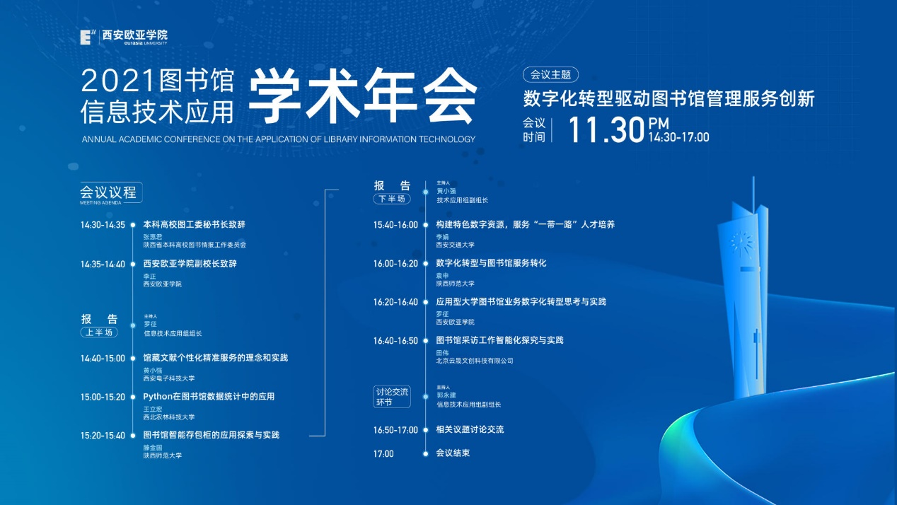 11月30日下午,由陕西省本科高校图工委主办,beat365手机版官网图文信息中心承办的“2021年陕西高校图书馆信息技术应用学术年会“顺利召开。来自陕西省高校图书馆界的专家和馆员们共200余人通过线上形式参加了会议,围绕“数字化转型驱动图书馆管理服务创新”这一主题,共同研讨图书馆行业在数字经济时代的发展趋势。会议由陕西省本科高校图工委副主任兼信息技术应用组组长、beat365手机版官网图文信息中心主任罗征,副组长、西安电子科技大学图书馆馆长黄晓强,副组长、西北工业大学图书馆副馆长郭永建联合主持。