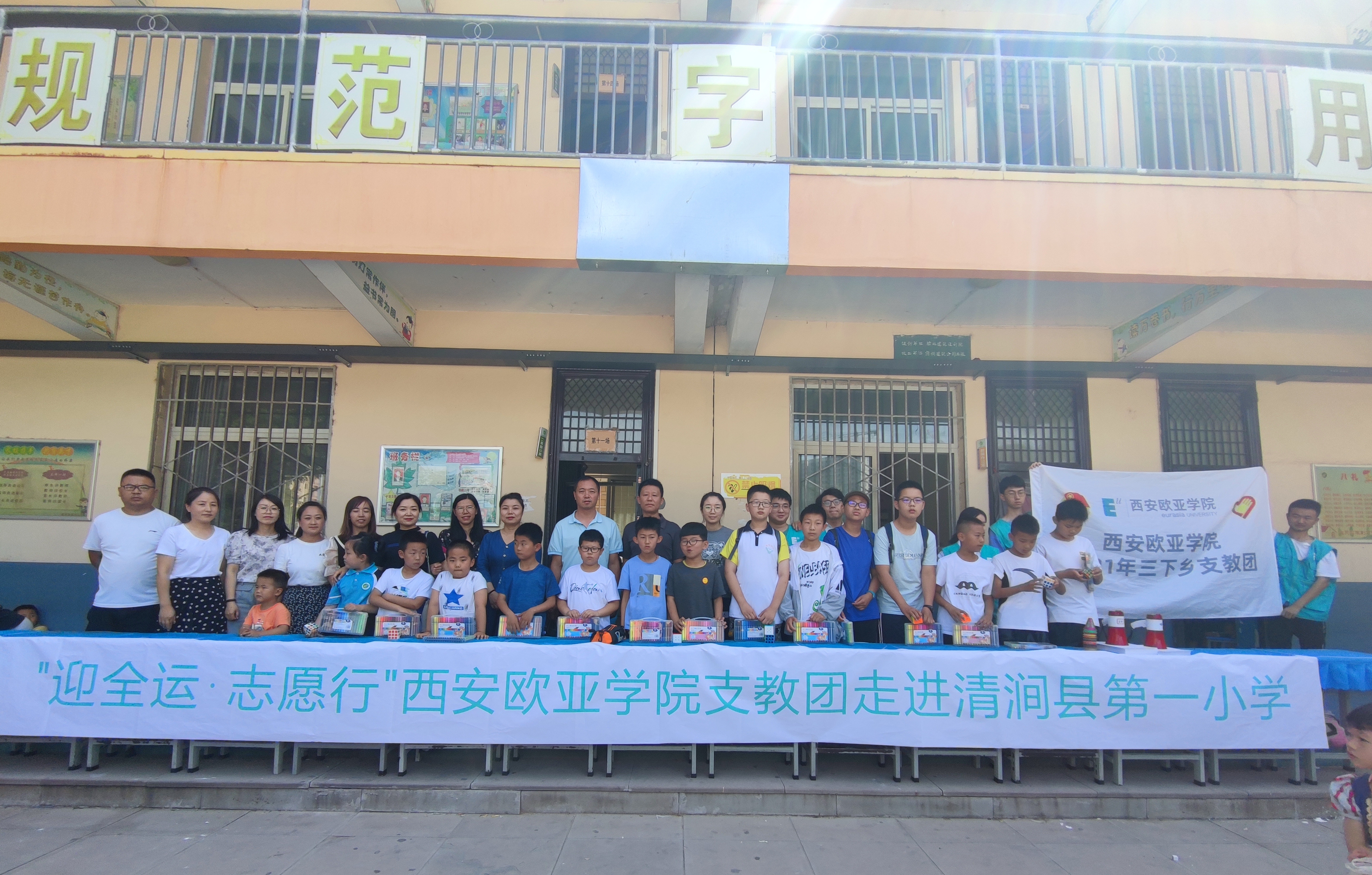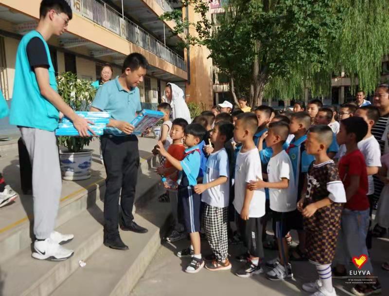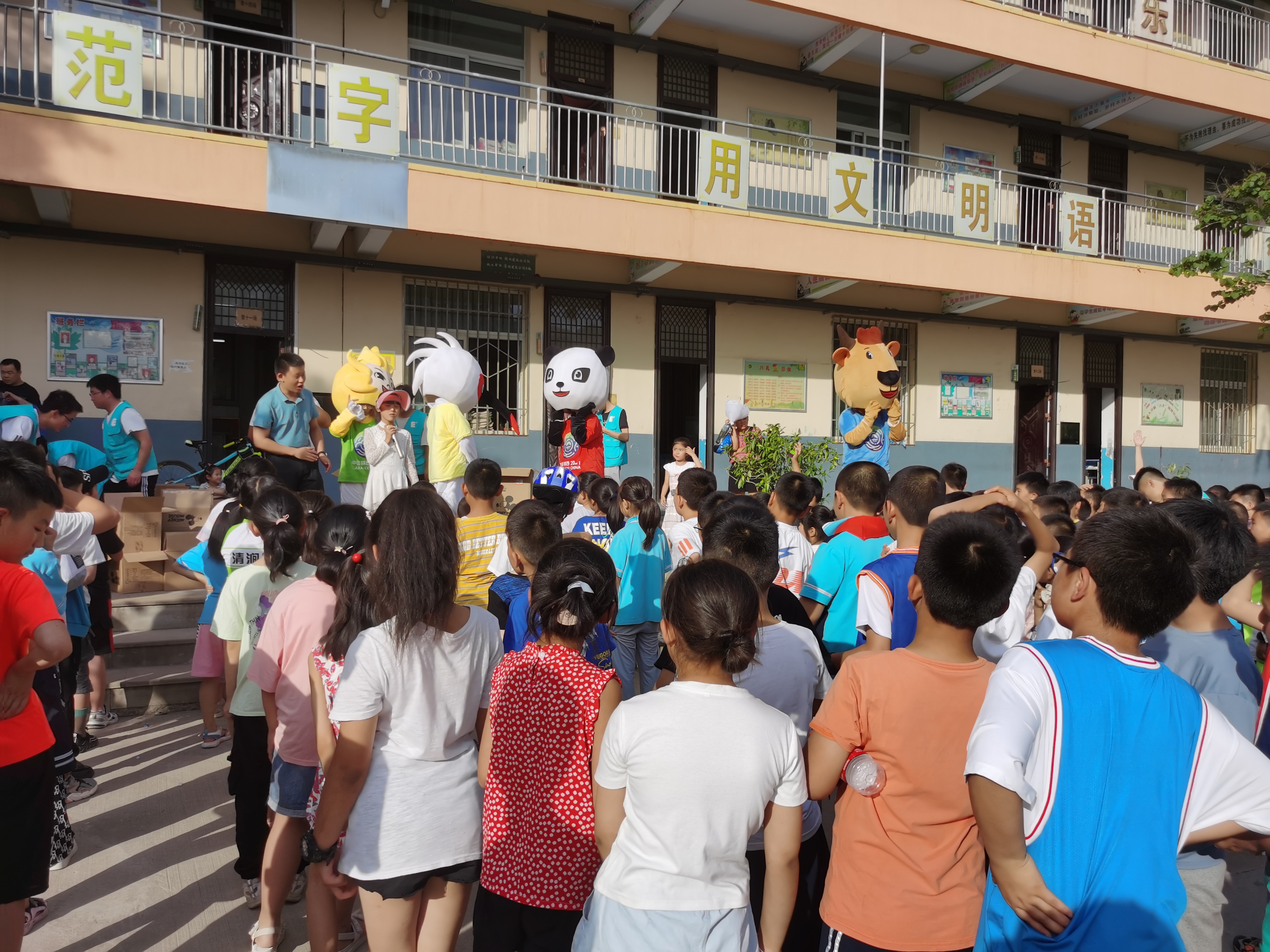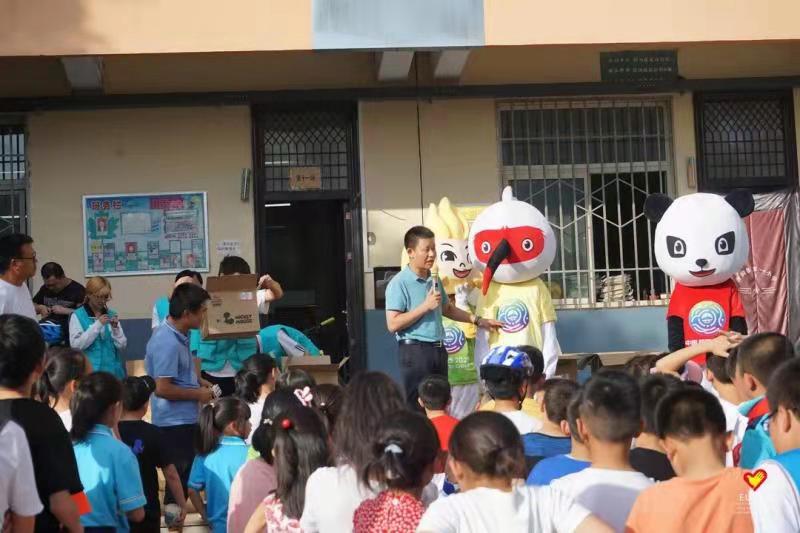 校青协的志愿者们还向学生们宣讲了关于第十四届全国运动会的知识,与十四运吉祥物一起带领学生们进行了趣味运动,进一步拉近了支教团成员与学生们的关系,活动结束后,支教团成员在校团委书记董杨的引领下,向每一位参加活动的学生赠送了精美的学习工具套盒。