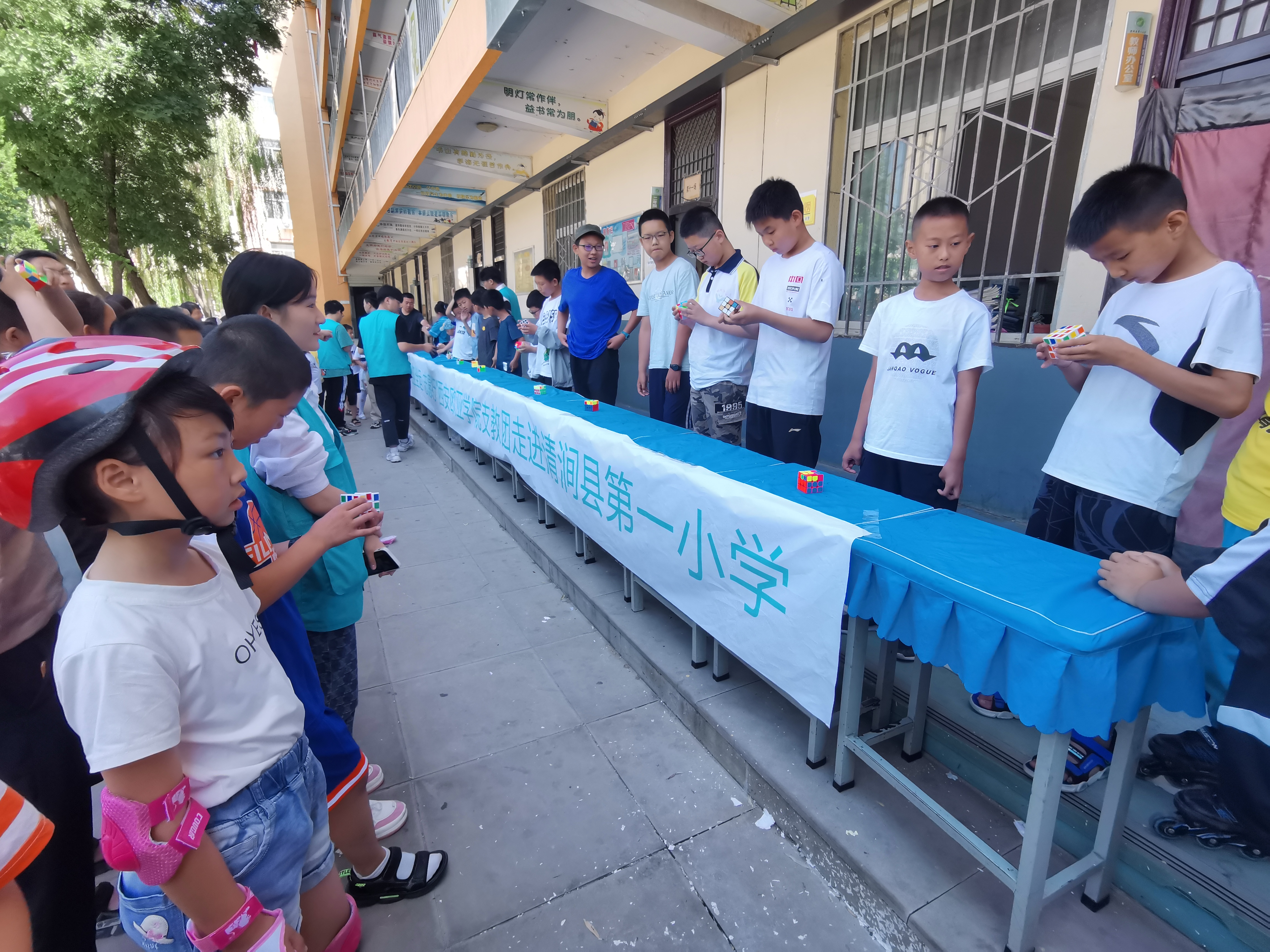 7月3日至4日,beat365团委书记董杨、副书记李艳带领学校19名志愿者一同前往清涧县第一小学开展社团训练支教活动。本次支教以拓展学生课外知识,培养兴趣爱好为主要目标,开设轮滑和魔方2个兴趣班, 270余名学生接受了培训。