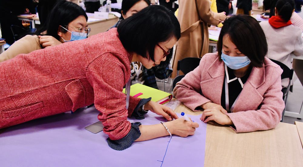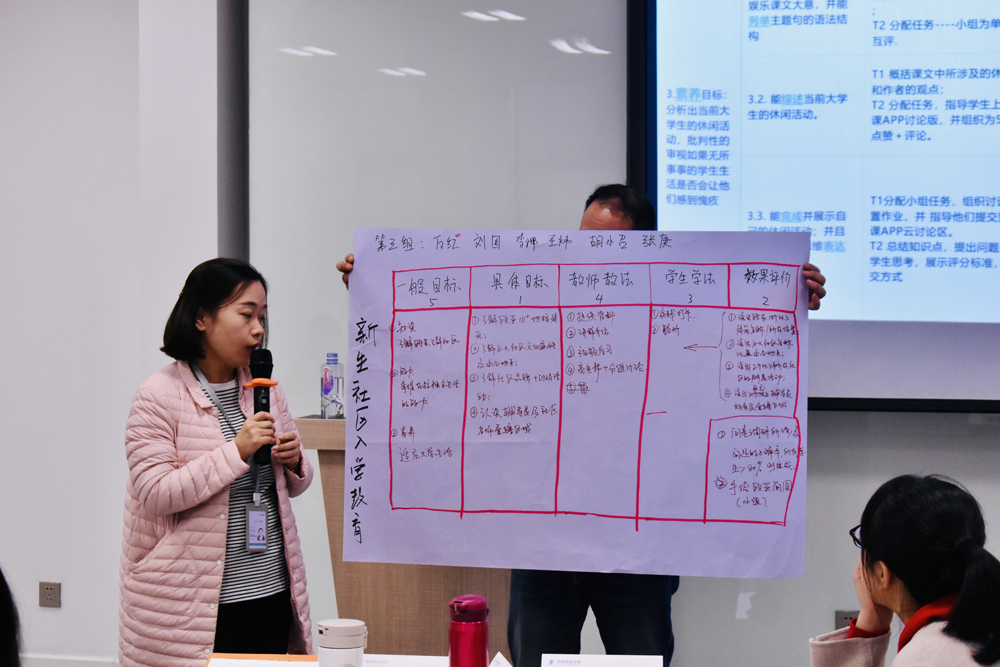 在培训的实践环节,各位辅导员老师针对国际流行的反向课程设计矩阵进行了具体的实操。各小组按照具体目标-效果评价-学生学法-教师教法-一类目标的步骤,结合工作实践,现场设计了一堂社区班会,并以小组方式进行分享。