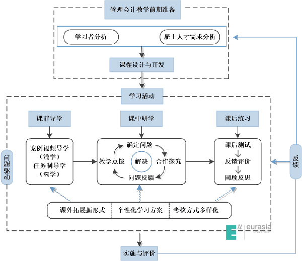 当前,在人工智能、财务机器人、财务共享的新时代下,对财务人员需求也在不断改变,获取知识、信息的途径越来越便捷,很多原创思想、知识与技术迸发,要想提高培养人才效果,在课程体系更新迭代中保持先进性,我们需要打开围墙,主动融入社会,加强创新思维,不断探索课程建设新思路,让学生对社会、企业有更多了解。基于上述观点课程组现开发出以下模型,在原有的课程环节基础上增设课外拓展环节,参考英国体系的个性化的学习方案和多重考核方式从而进行学习评价。