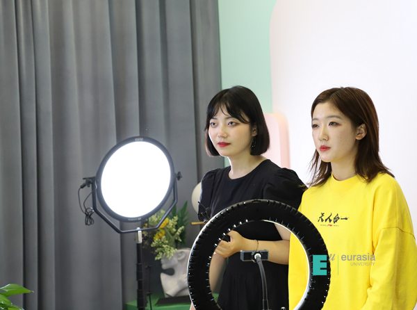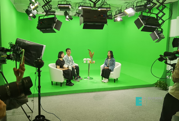 在参观京东云电商直播中心时,同学们不仅见到了标准直播间里不同类型的带货主播,还近距离观察了生鲜直播间、3e数码直播间及演播室的大致情况。期间,林立伟总经理提出可以选几名同学体验宣传视频的拍摄过程。同学们踊跃报名,七名幸运的小伙伴被选中,在各个直播间短暂体验了“主播”这一职业。