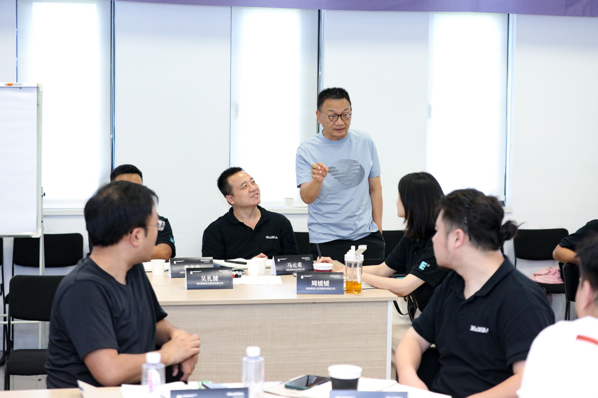 课程结束后,胡建波与学员们围坐一起,就“你所在企业的事业理论三个假设”为题展开讨论。他进一步明确了学校将始终坚持开放办学,倡导终身学习、保持知识更新的理念。学校也将继续为社会培养更多菁英管理人才,为14万余名欧亚校友的成长与发展提供更多实际的帮助。