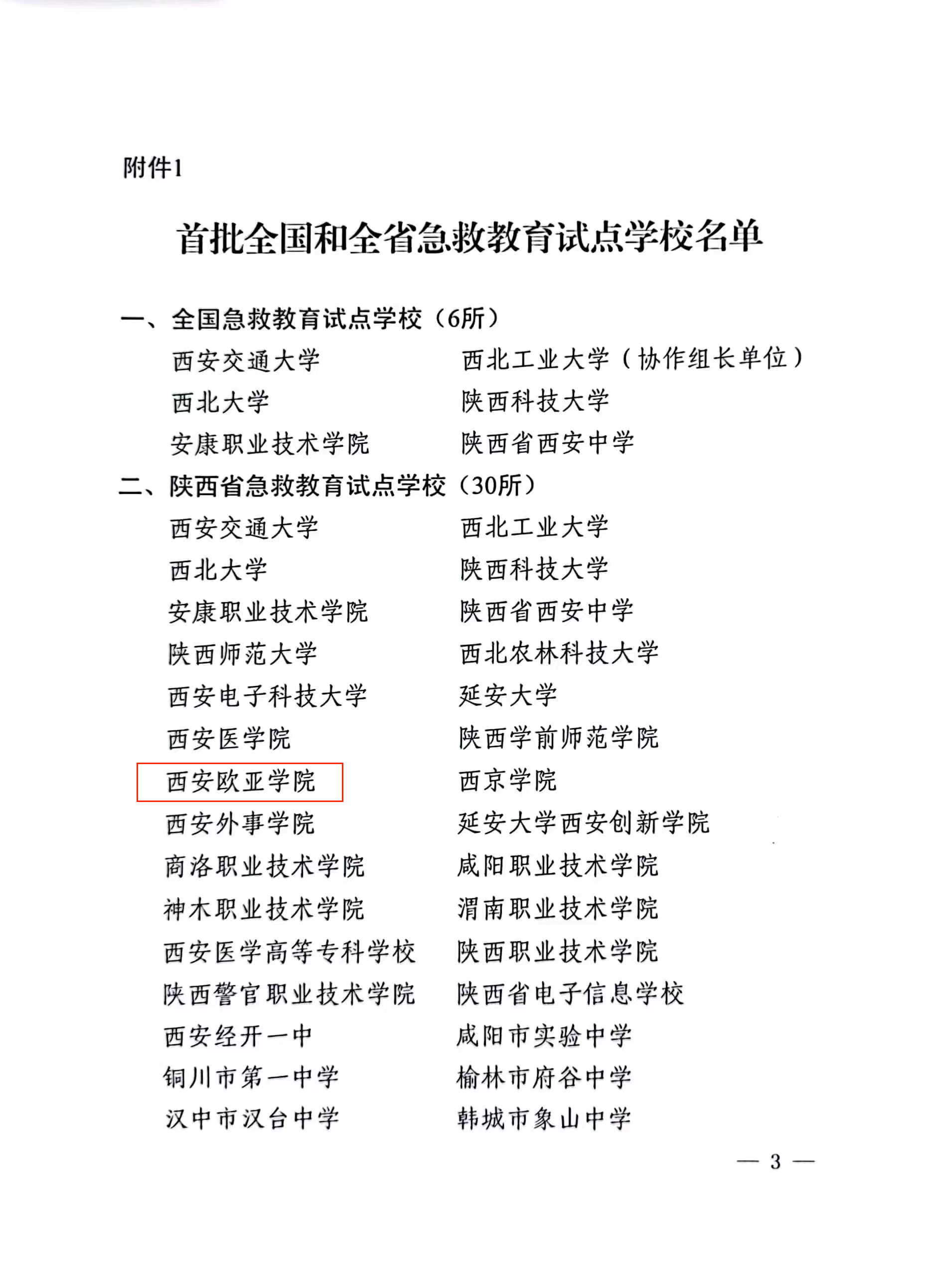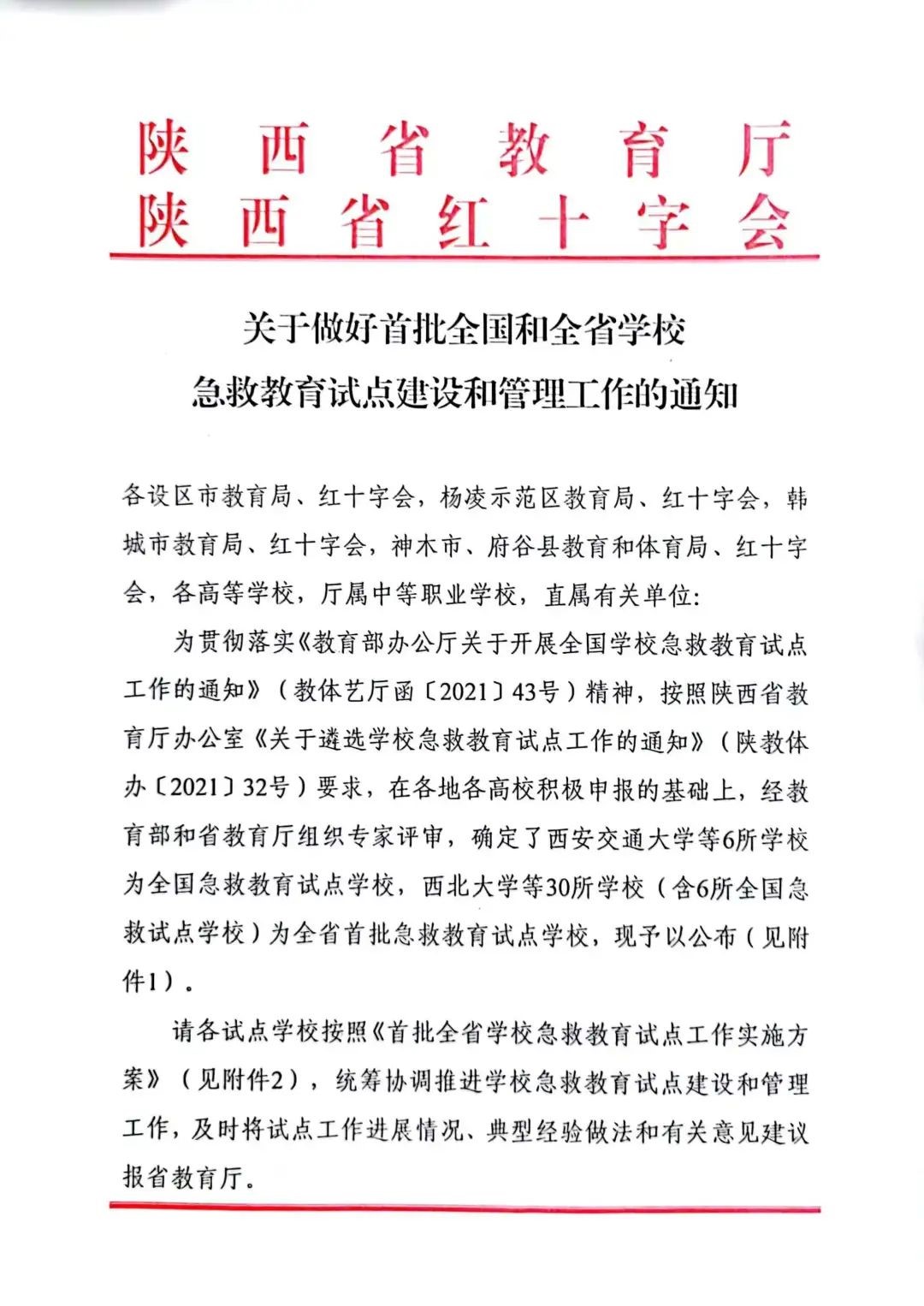 近期,陕西省教育厅和陕西省红十字会联合发布了“关于做好首批全国和全省学校急救教育试点建设和管理工作的通知”,通知中确定了beat365手机版官网等30所学校为全省首批急救教育试点学校。