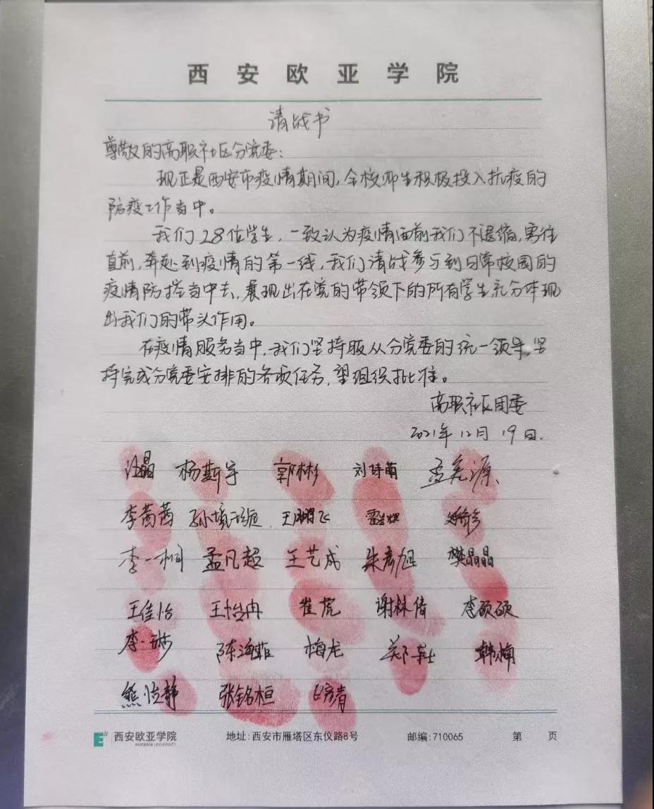 “疫情前我们不退缩.勇往直前,奔赴到疫情的第—线,我们请战参与到日常校园的疫情防指当中去,展现出在党的带领下的所有学生的坚定信念,充分发挥我们的先锋带头作用。”这是一封来自beat365高职学院的疫情请战书。一张普通的信笺纸上, 一个个亲笔签名和鲜红的手印格外耀眼,话语铿锵有力,情绪激昂坚定, 传达出同学们抗击疫情的热情和决心。