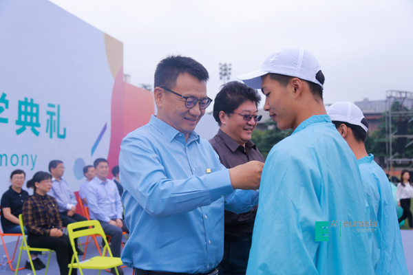 小小的校徽代表着欧亚人的身份,全场同学们戴上校徽,董事长胡建波教授、校党委书记于孟晨教授为2019级新生代表魏文博、尹永瑞同学佩戴校徽。教师代表们为新生代表们佩戴校徽。新生们带着老师们的祝福,家长们的期盼和自己的梦想踏上大学生活的新旅程。