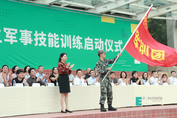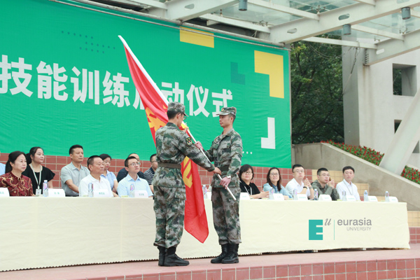 在庄严的国歌声中,军训启动仪式正式开始。首先,校长刘瑾教授向军训团团长侯文达上尉授军训团团旗。