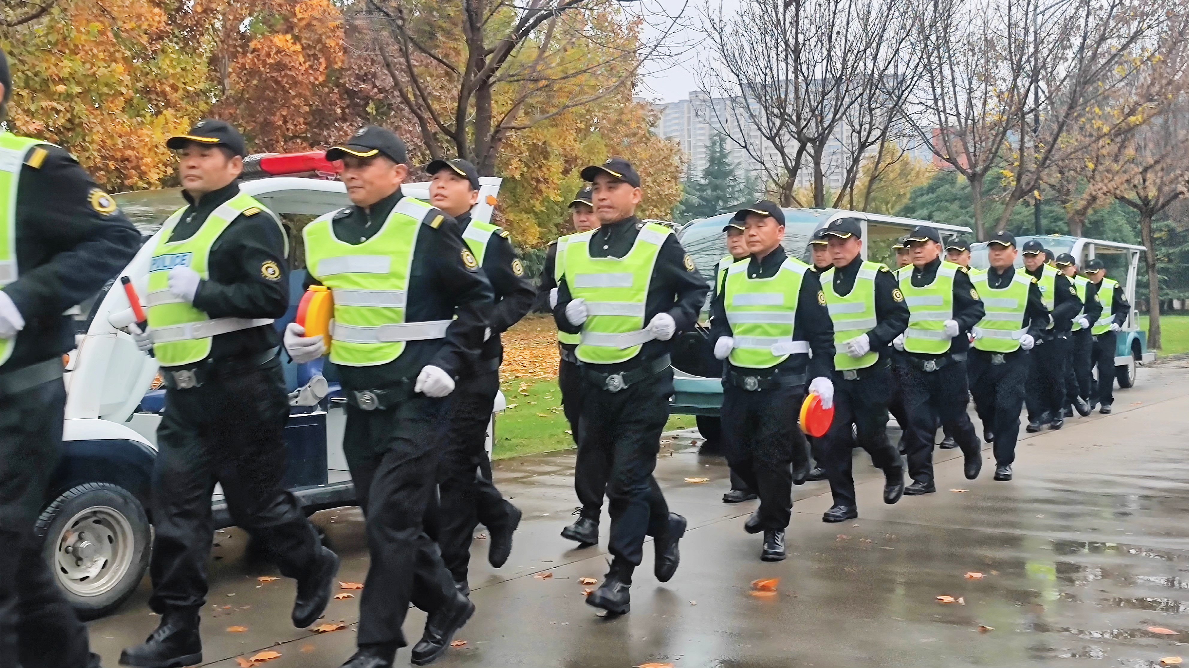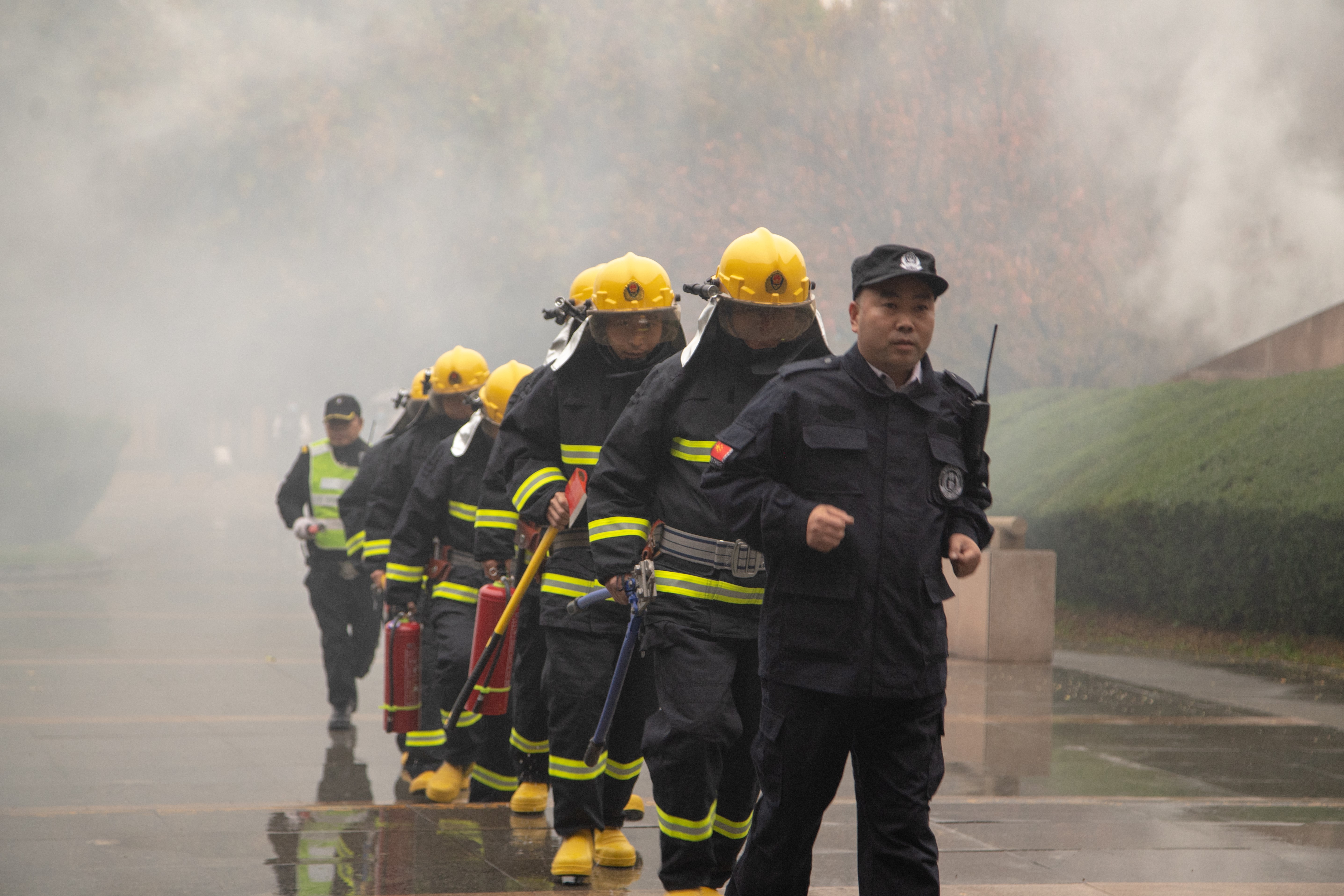 演练现场,图书馆西门道路两侧,两辆鸣着警笛的巡逻车引导多辆紧急车辆呼啸着赶到了现场。现场警戒组,根据现场的实际情况,设立警戒区,阻止闲杂人员进入警戒线,为抢救的人员、物资开辟通道,保障人员、物资迅速转移到安全地带。灭火行动组携带灭火器第一时间冲进现场,利用平时训练掌握的灭火技能,身着防护服,手提灭火器第一时间进入火灾事故现场控制火情,同一时间,后勤集团健康服务中心到现场做好伤员救护,公共服务中心迅速做好断电保护。