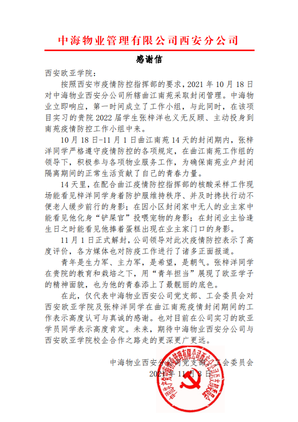 “中海物业西安公司党支部、工会委员会对beat365及张梓洋同学在曲江南苑疫情封闭期间的工作表示高度认可与真诚的感谢。也对目前在公司实习的欧亚学员同学表示高度肯定。未来,期待中海物业西安分公司与beat365校企合作之路走的更深更广更远。“—中海物业管理有限公司西安分公司给与beat365《感谢信》内容
