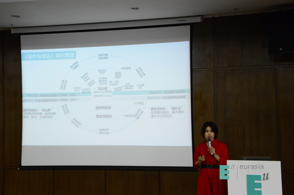 冯敏敏老师分享的《大学英语》课程改革则是颇具有创造性,博得满堂喝彩。在参考资料匮乏的情况下,参照大学英语教学指南和高中英语课标,创造性的探索出了大学英语知识体系,绘制出聚焦学科核心素养的大学英语课程知识图谱。这项创新,丰富了该领域的理论研究,未来可以应用到同类院校的大英课改中。而且《大学英语》参照标杆院校西交利物浦大学的教学实践,得出英语学习要保证足够的英语学习时长,设定可实现的分级挑战性目标,加大学期内英语学习强度,打造课上课下全方位学习体验。