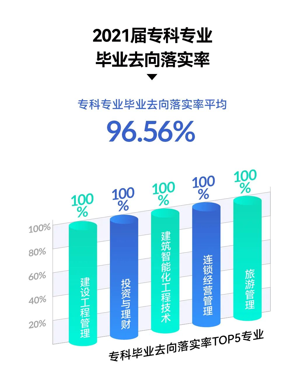 2021届专科毕业生毕业去向落实率平均达96.56%,各专业落实率均在九成以上,其中建设工程管理、投资与理财、建筑智能化工程技术、连锁经营管理、旅游管理五大专业落实率均为100.00%,实现充分就业。