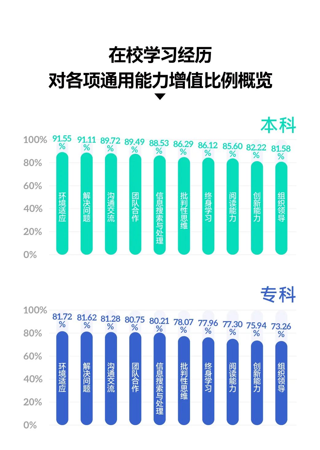 2021届毕业生认为,通过在校期间的学习与实践,各项通用能力均有所增长,并在环境适应、解决问题以及沟通交流三项能力中获益匪浅。