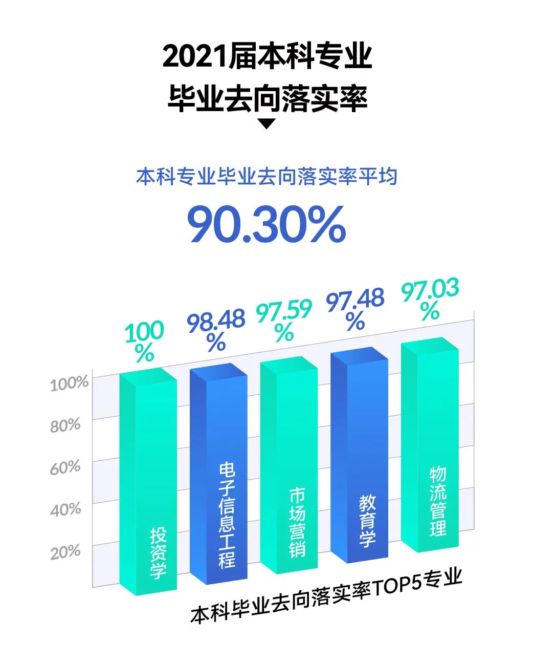 2021届毕业生毕业去向落实率平均达90.30%。其中,落实率前五名的专业中,商科占三位,投资学专业落实率达100.00%,符合beat365以管理、经济学科为主,艺术、文学、教育、工学等协调发展的学科定位。