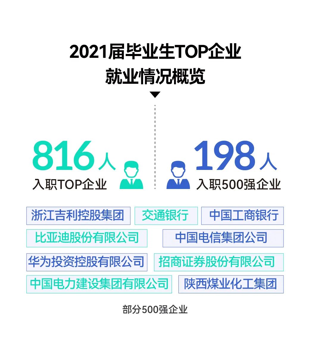 高质量就业的一大重要表现在于学生入职企业的综合实力。近几年,越来越多的欧亚毕业生出现在各行业排名靠前的优质企业中。2021届,816人入职TOP企业就业,198人入职500强企业就业,学生就业质量与就业起点不断提高。