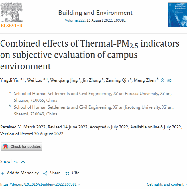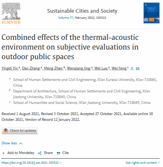 2020年起,人居环境学院微气候研究团队开展了“基于声热环境预测模型的景观优化与人因工程研究”。2021年在国际顶级学术期刊《Sustainable Cities and Society》上以 Research Article 形式发表研究论文“Combined effects of the thermal-acoustic environment on subjective evaluations in outdoor public spaces”(室外公共空间热声环境对主观评价的综合影响)。