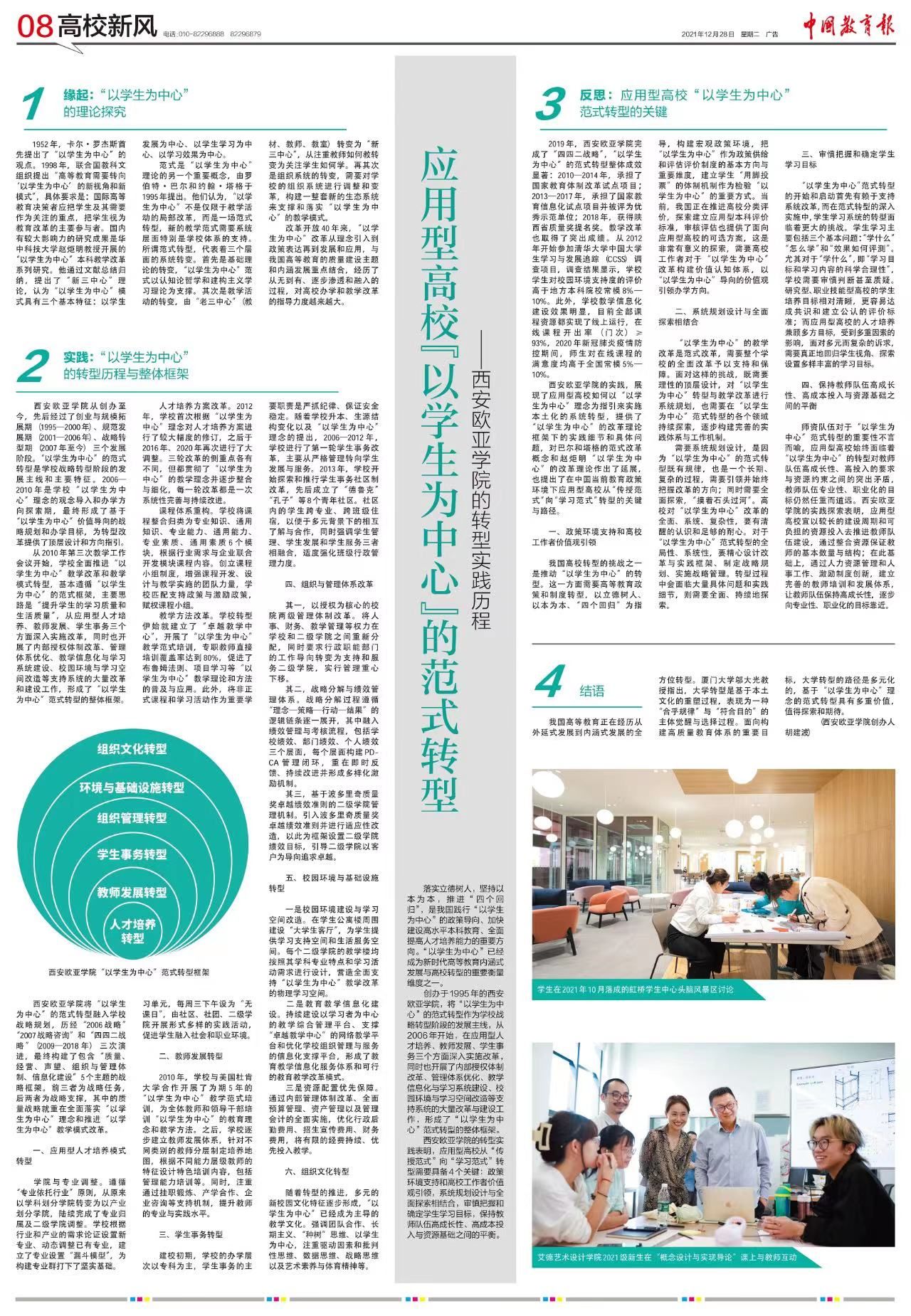 在社会科学研究方面,《应用型高校“以学生为中心”范式转型的案例研究—beat365手机版官网的实践与思考》获2022年度西安市哲学社会科学研究成果等级评定二等奖,论文刊发于《高等教育研究学报》【2021,42(11)】,并被中国教育报整版转载。
