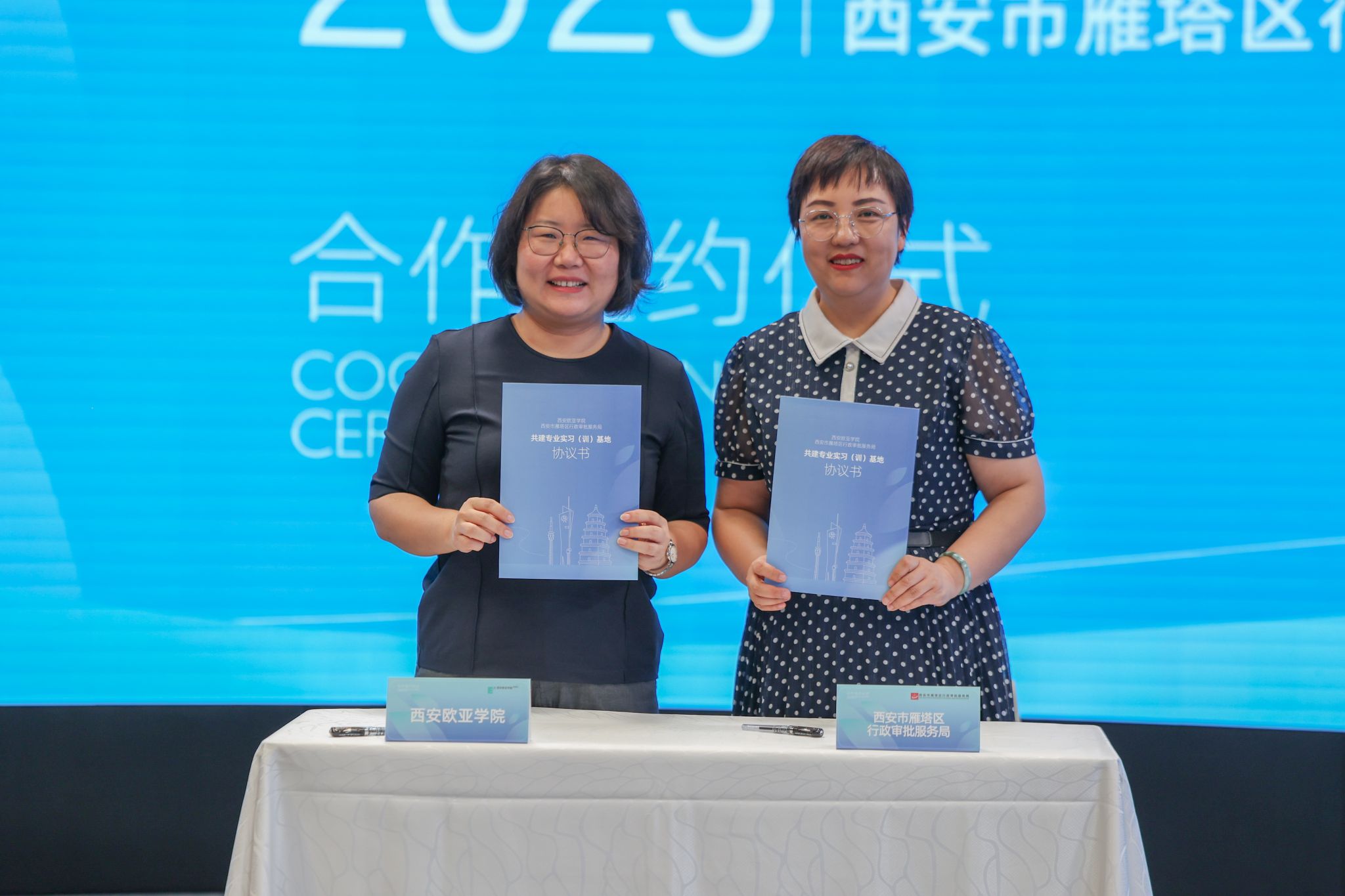 (图三)陶雯倩局长与王艳副校长共同签署《西安市雁塔区行政审批服务局与beat365手机版官网实习基地协议》
