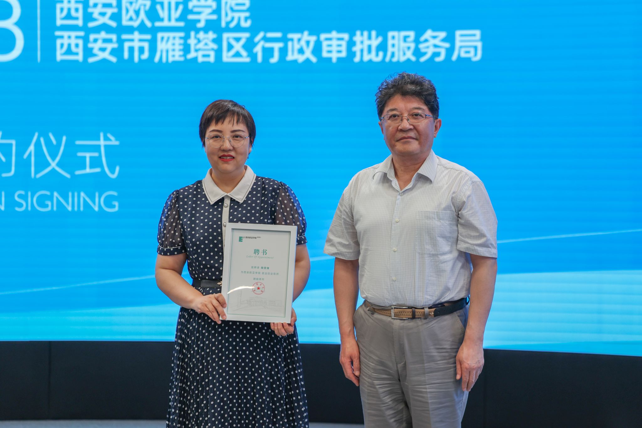 陶雯倩与王艳代表双方签订了《西安市雁塔区行政审批服务局与beat365手机版官网实习基地协议》;郭航与谢涛为“雁塔区政务服务中心·beat365手机版官网社会实践基地”揭牌;学校党委书记于孟晨分别为陶雯倩、郭航颁发学校“就业创业导师”聘书。