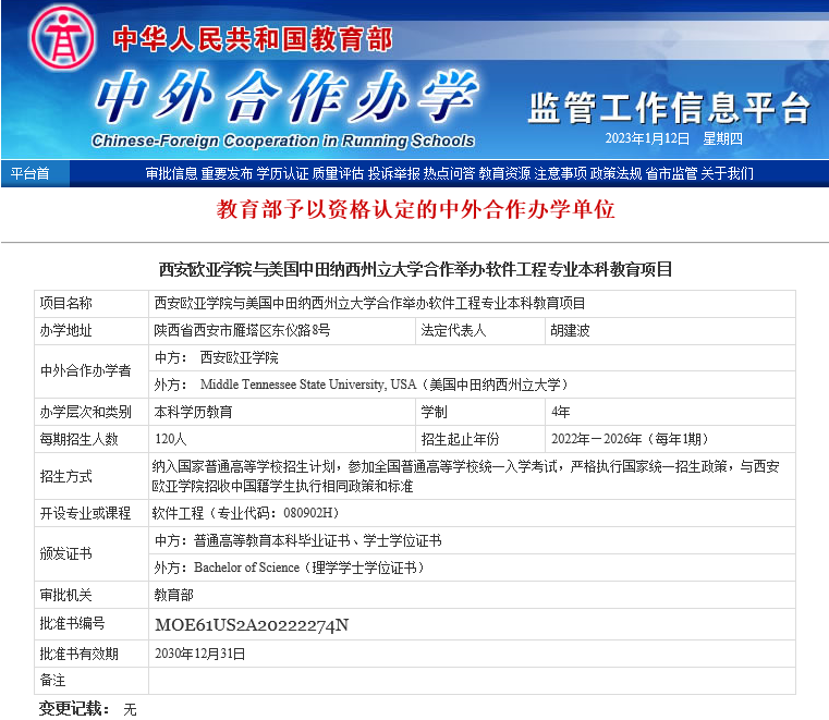 beat365首个中外合作办学项目获批,与美国中田纳西州立大学合作举办的软件工程专业本科教育项目迎来首届学生。