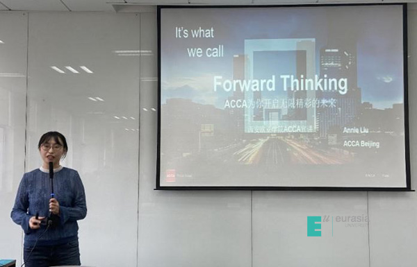 ACCA北京办公室教育及发展主任刘芳带来“ACCA为你开启无限精彩的未来”主题演讲,刘主任详细介绍了ACCA以及ACCA为学生所提供的教学、学生发展及就业方面的服务与支持,并鼓励同学们以学习与努力回馈大学时光。会计学院ACCA中心主任吴晓光教授代表会计学院向ACCA北京办公室赠送了学校礼品。