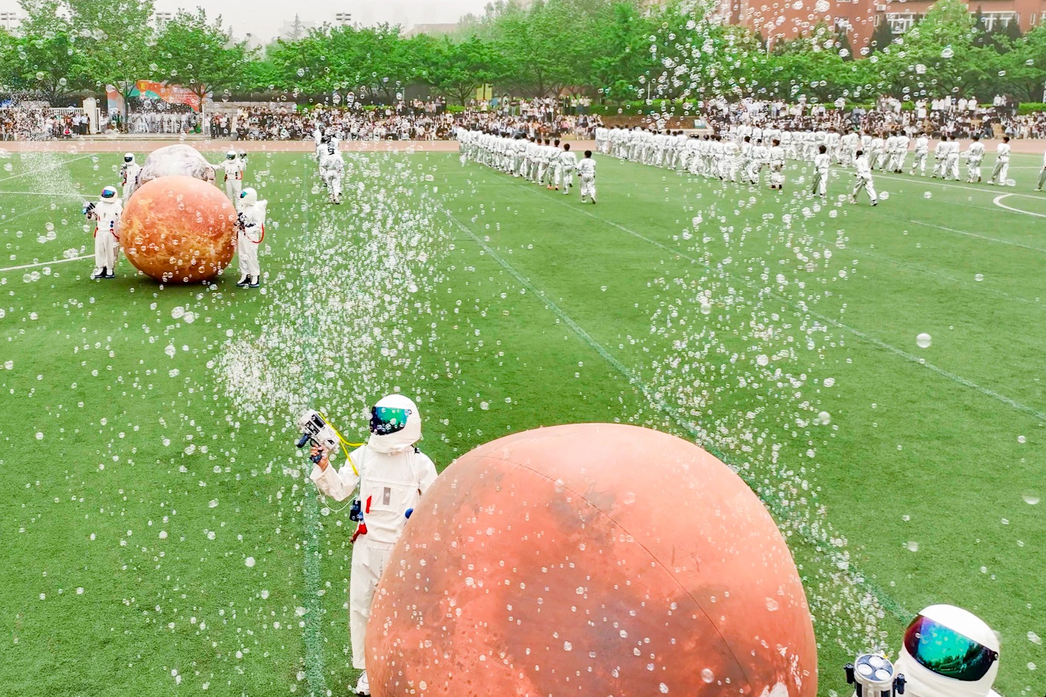 鱼跃海洋,赛车飞驰,光影联动,环宇航行……开幕式最后,多个体育俱乐部与青年社区带来气氛热烈、激情活力的团体操表演。四组大型团体操分别以运动、青春、多元和国际为主题演绎。“Sports Time”单元,风驰电掣的轰鸣,精彩纷呈的赛结旗,少年们燃爆欧亚的速度与激情。“悦动海洋”单元,优雅的少女们身着蓝色长裙如海水流动,手持气球似浪花翻腾,她们在梦幻海洋里踏歌而行,于运动中展现女性力量。体育舞蹈、啦啦操、橄榄球、骑行、轮滑、滑板……光影联动单元气氛激情澎湃,从“潮运动”到“常运动”,青春的音符奏响欧亚体育改革的最强音;最后的“星河漫舞”单元,宇航员们跨过星辰大海,在太空遨游漫步,这是欧亚独有的浪漫,为你指引着前方征途。