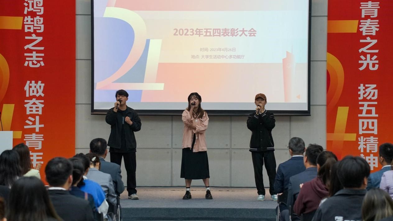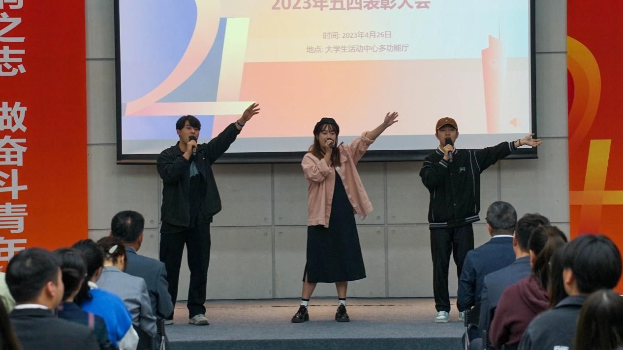 表彰大会临近尾声,大学生艺术团的三位同学带来小合唱《我们都是追梦人》。“海阔天空敞开温暖怀抱,我们都是追梦人。我们乘风破浪举目高眺,心中力量不怕万万里路遥。”正如歌词所唱的这般,青年们正处于追梦的年纪,当追光而遇、沐光而行,坚守初心,勇于追梦。