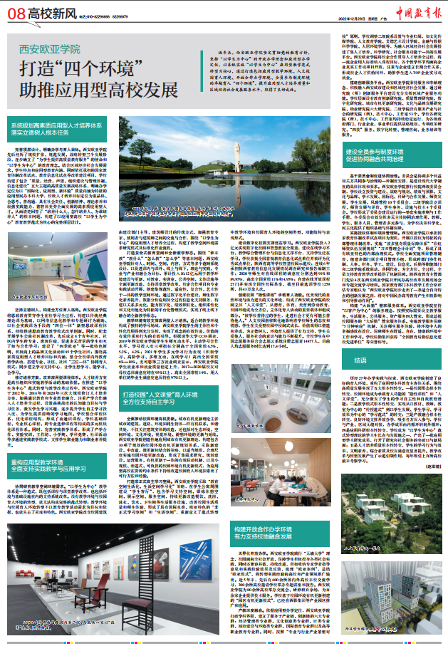 2022年12月28日,《中国教育报》第8版以《beat365手机版官网:打造“四个环境”,助推应用型高校发展》为题,介绍了beat365手机版官网在重构应用型教学环境、打造人文校园育人环境、构建开放合作办学环境、建设全员参与制度环境方面的做法与经验。现全文发布如下: