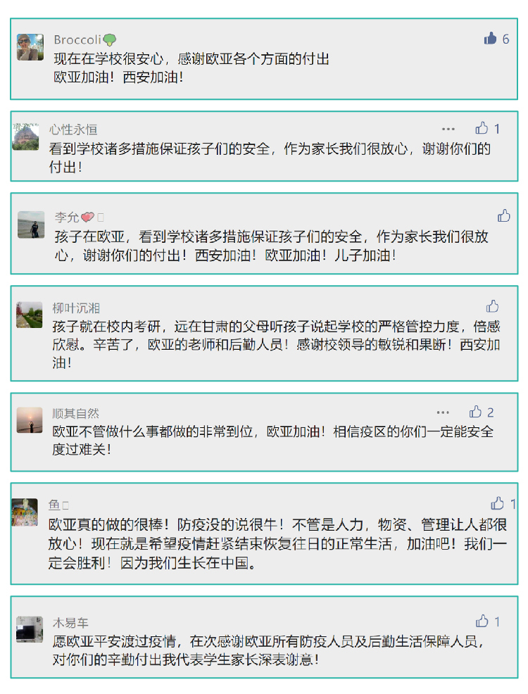 在这场“大考“中,共有161名后勤保障人员、109名保洁人员、441名餐饮保障人员、228名留校教师、1200名学生志愿者、856名居家办公教师和15621名在校学生,都在身体力行地直面挑战,因为你们的责任与担当,方能铸就欧亚穿越凛冬的勇气与信心。