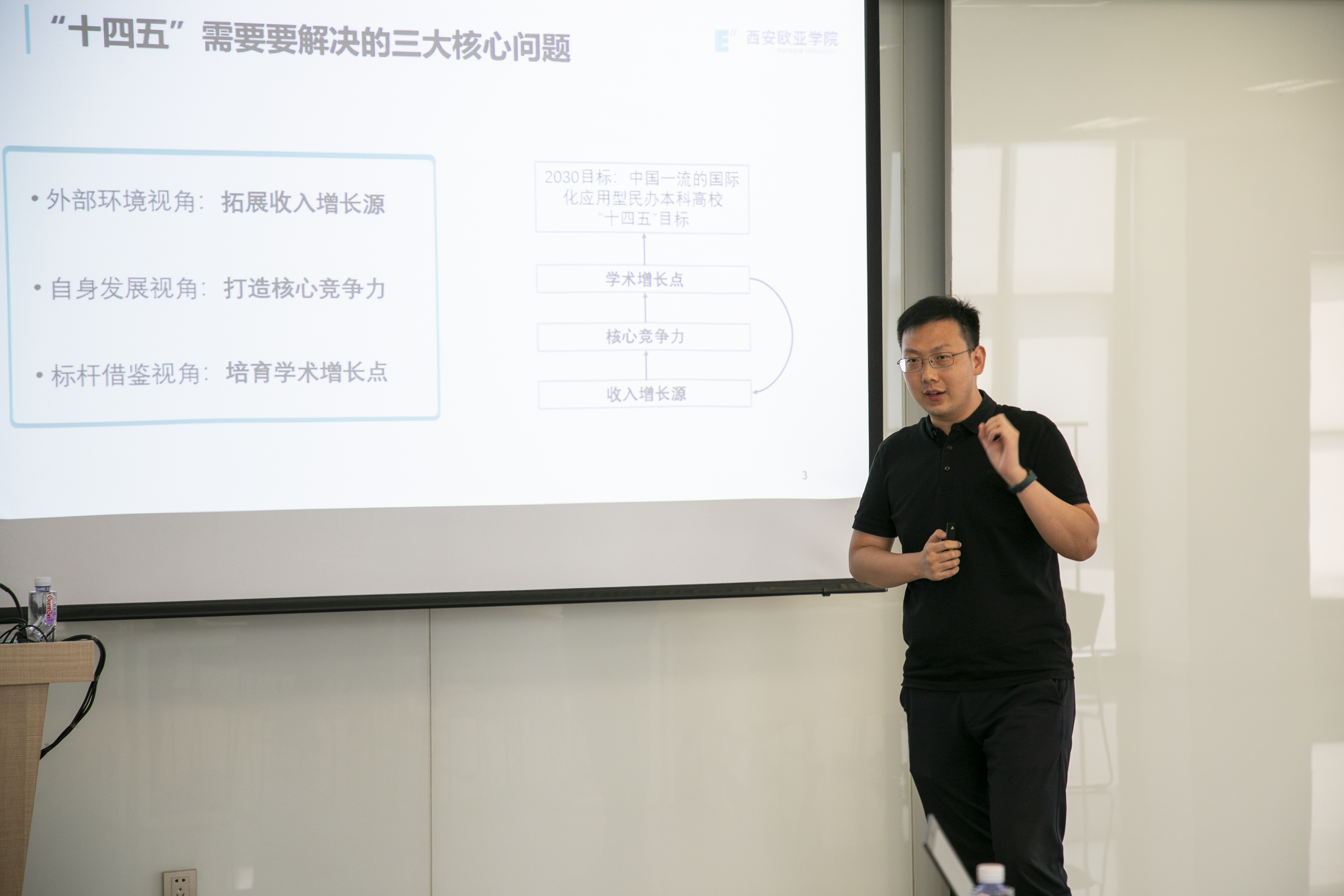 赵健以“开放发展,共创价值”为题,分享了教育创新研究院落实“十四五”规划的思考。他详细分析了“十四五”期间学校需要解决的三大核心问题:培育学术增长点,打造核心竞争力,拓展收入增长源。开放办学是学校国际化战略和应用型定位的基本要求,赵健还对学校治理体系如何支持“开放办学”作了阐述。