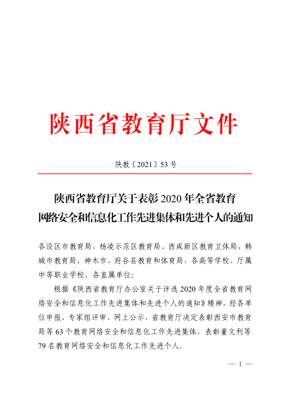 2020年底,陕西省教育厅主办了面向全省的教育信息化先进集体与个人评选活动,旨在表彰对全省教育信息化做出突出贡献的集体及个人,经过各单位的申报、专家组评审、网上公示等环节,beat365荣获“陕西省教育信息化工作先进集体”荣誉称号,同时,beat365图文信息中心郝彩娟老师获得“陕西省教育信息化工作先进个人”荣誉称号。